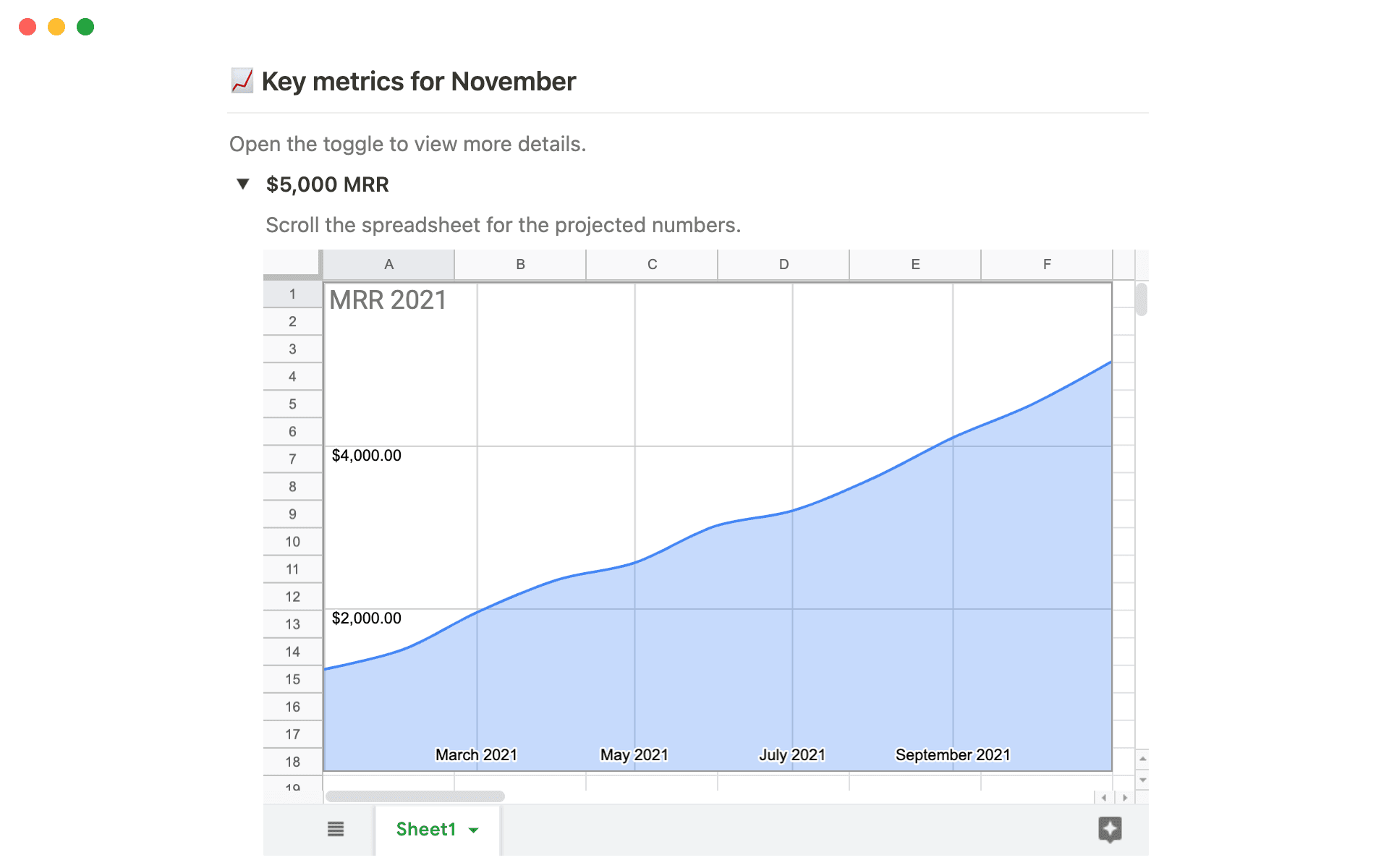 You can create a high-level summary with the option to easily access more in-depth, granular information through nested pages and gallery sections. “Notion is like a cross between an article and a website,” noted Shmulik Fishman, CEO of Argyle. With an email or slide deck, you need to find the right balance between giving enough information and not packing too much in. With Notion, investors choose how much depth they want to explore. This means you can send one document to multiple investors rather than sending a personalized update to each one. They’re in charge of their own journey through your update.
