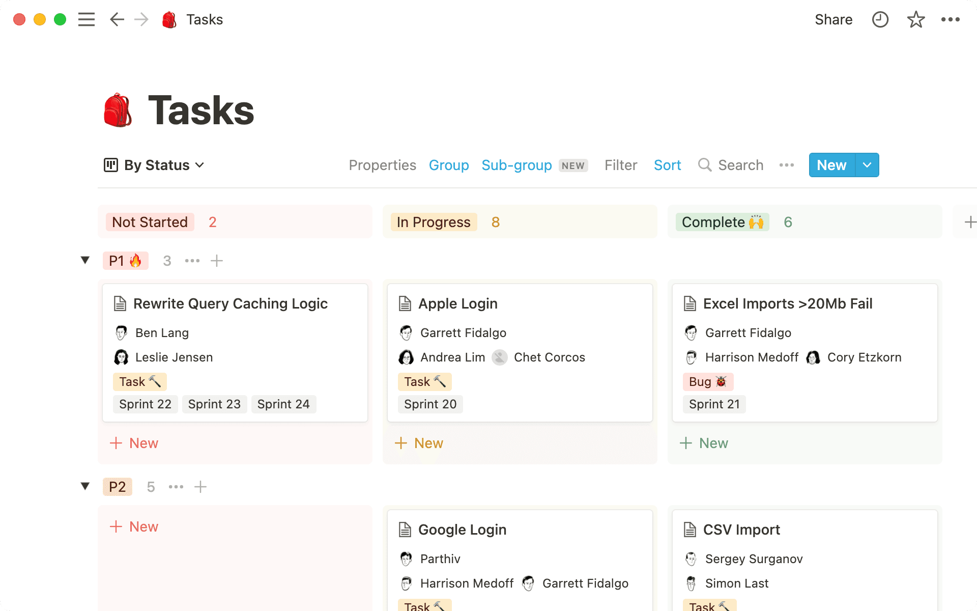 Si votre tableau kanban était déjà trié à l’aide d’une propriété d’état (par exemple, « Pas commencé », « En cours », « Terminé »), vous pouvez désormais organiser ces tâches en sous-groupes par priorité, équipe, destinataire ou toute autre propriété pertinente, sans toucher à vos colonnes d’état.Groupez par davantage de propriétés (relation, nombre, date, etc. Auparavant, vous ne pouviez regrouper vos éléments qu’à l’aide des propriétés de type « Sélection », « Sélection multiple » et « Personne ». Désormais, presque tous les types de propriétés sont pris en charge : texte, nombre, date, case à cocher, URL, e‑mail, téléphone, formule, relation, date de création, créé par, dernière modification et dernière modification par.